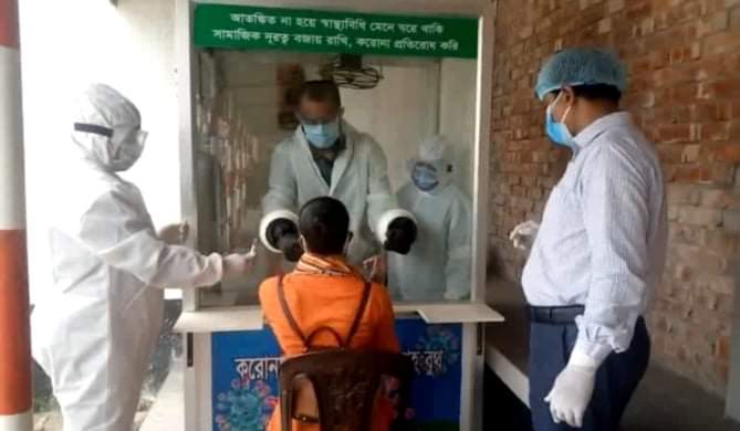 আজ সকালে জেলার চান্দনা স্কুল এন্ড কলেজ মাঠে করোনা পরীক্ষার নমুনা সংগ্রহের বুথ স্থাপন করা হয়েছে । সকাল থেকেই ওই বুথে ২৫ জন করোনা সন্দেহ রোগীর নমুনা সংগ্রহ করা হয়েছে ।একটি কাঁচের তৈরী বুথের মধ্যে থেকে নিদৃষ্ট দুরত্ব বজায়ে রেখে ওই নমুনা সংগ্রহ করা হচ্ছে ।উপজেলা স্বাস্থ্য কর্মকর্তা ডা. মোঃ শাহীন জানান, এই বুথ স্থাপনের মধ্যদিয়ে সন্দেহভাজন সকল মানুষের করোনার নমুনা স্বাস্থ সম্মতভাবে সংগ্রহ করা যাবে । আমাদের ৭১ বাংলা টিভির এম এ আজিজ জানান। যাতে করে আরো সহজে এবং দ্রুততম সময়ে করোনা ভাইরাসের নমুনা সংগ্রহ করা যায় তারজন্য জেলা প্রশাসন কাজ করছে । এরই মধ্যে জেলার সদরে এবং প্রত্যেকটি উপজেলা স্বাস্থ্য কেন্দ্রে এই বুথ স্থাপন করা হয়েছে ।জেলার সিভিল সার্জন ডাঃ খায়রুজ্জামান জানান, সব কিছু ঠিকঠাক থাকলে প্রতিদিন গড়ে দেড় থেকে দুইশ জনের নমুনা সংগ্রহ করা যাবে ।