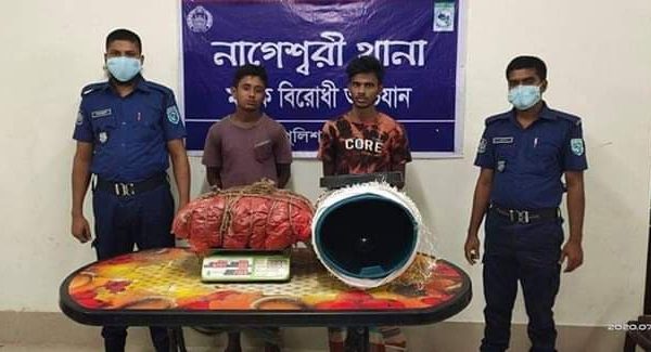 পুলিশ সুপার, কুড়িগ্রাম জনাব মোহাম্মদ মহিবুল ইসলাম খানের নির্দেশে সারা জেলায় মাদক বিরোধী অভিযান অব্যাহত রয়েছে। মাদক বিরোধী অভিযানে নাগেশ্বরী থানা পুলিশ উপজেলা পরিষদ গেট সংলগ্ন নৈশকোচ এনা কাউন্টারের সামনে থেকে বৃহস্পতিবার ১৬ জুলাই রাত সাড়ে নয়টায় গোপন সংবাদের ভিত্তিতে এস আই মাসুদ করিমের নেতৃত্বে পুলিশ দল প্লাস্টিকের ড্রামের ভিতর বিশেষ কায়দায় রাখা ৭ কেজি গাঁজাসহ উপজেলার হীরার খামার গ্রামের আক্কাছ আলীর পুত্র মোঃ আঙ্গুর হোসেন(২২) ও একই গ্রামের আব্দুল জব্বারের পুত্র রবিউল ইসলাম (২৫) নামে দুই মাদক ব্যবসায়ীকে গ্রেপ্তার করা হয়েছে। এ ব্যাপারে ১৭ জুলাই মুঠোফোনে এ প্রতিবেদকে নাগেশ্বরী থানার অফিসার ইনচার্জ মোঃ রওশন কবির জানান গ্রেপ্তারকৃতদের বিরুদ্ধে মাদক আইনে মামলা দায়ের করা হয়েছে। শুক্রবার কুড়িগ্রাম জেলা কারাগার প্রেরণ করা হয়েছে।