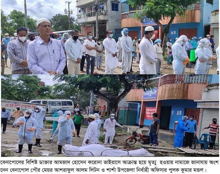রোববার (৫ জুলাই ) সকাল সাড়ে ৯ টার সময় বেনাপোল পৌর সভার দিঘিরপাড় রজনী ক্লিনীকের সামনে ডাক্তার আমজাদ হোসেনের নামাজে জানাযা অনুষ্ঠিত হয়। এ সময় মেয়র লিটন বলেন, আমজাদ হোসেন ছিলেন বেনাপোল তথা শার্শা বাসির প্রানের মানুষ। তাকে যে যেখানে যে সময় ডেকেছে সে সময় যেয়ে হাসি মুখে চিকিৎসা সেবা দিয়েছেন। তিনি এই জনপদের মানুষের কথা ভেবে এবং চিকিৎসা সেবায় বেনাপোলকে এগিয়ে নিয়ে যাওয়ার লক্ষে নিজ উদ্যেগে রজনী ক্লিনীক নামে একটি প্রতিষ্ঠান গড়ে তোলে। সেখানে বেনাপোলের মানুষ গভীর রাত্রে যেয়ে ও চিকিৎসা নিতে পারছে। প্রসুতিরা আর রাস্তার ঝাকুনি খেয়ে যশোর না যেয়ে এই ক্লিনিকে স্বাস্থ্য সেবা গ্রহন করছে। তার এই সময় চলে যাওয়া এই জনপদের জন্য এক অপুরনীয় ক্ষতি হয়ে গেল।