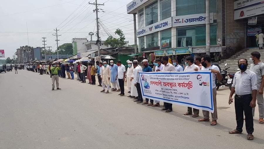 যশোরের শার্শা উপজেলায় করোনা ভাইরাসে ক্ষতিগ্রস্ত কিন্ডার গার্টেন স্কুল গুলোর জন্য প্রধানমন্ত্রীর নিকট আর্থিক সহযোগিতা আথবা সহজ শর্তে ঋণের দাবিতে অবস্থান কর্মসূচি পালন করেছে শিক্ষকরা।