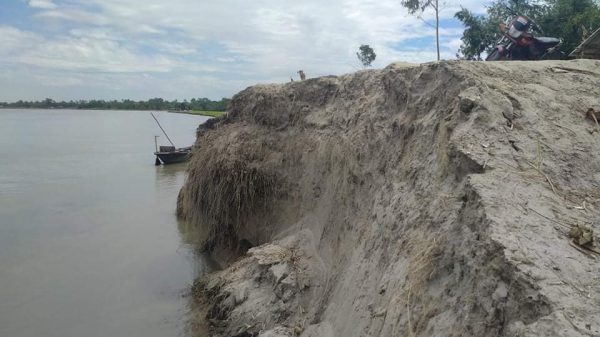 কুড়িগ্রামে বন্যার পানি কমে গেলেও নদী ভাঙ্গন আতঙ্কে শতাধিক পরিবার তিনটি পরিবার নিরাপদ আশ্রয়ের সন্ধানে চলে গেছে। সরেজমিনে জানা যায়, সদর উপজেলার পাঁচগাছী ইউনিয়নের মধ্য কদমতলা গ্রামে বাঁধ রাস্তায় আশ্রয় নেওয়া শতাধিক পরিবারের জীবন হুমকির মুখে পড়েছে। ইতিমধ্যে ধরলা নদের করাল গ্রাসে স্থানীয় ভোলা কালু মিয়া ও কয়সার আলীর বসত ভিটা হুমকির মুখে থাকায় নিরাপদ আশ্রয়ের সন্ধানে চলে গেছে। উত্তর-পশ্চিম দুটি বাঁধ রাস্তা দিন দিন নদীগর্ভে বিলীন হয়ে যাচ্ছে। স্থানীয় আফতার আলী রবিবার জানান দুটি বাঁধ রাস্তায় প্রায় শতাধিক পরিবার নদী ভাঙ্গনের হুমকির মুখে পড়েছে। এ ব্যাপারে স্থানীয় ইউপি মেম্বার আবু সাঈদ জানান শতাধিক পরিবারের ইতিপূর্বে ধরলা নদীর ভাঙ্গনে ভিটেমাটি সহায়-সম্পদ বিলীন হয়ে যাওয়ায় বেশ কিছুদিন থেকে তারা বাঁধের রাস্তায় আশ্রয় নিয়েছে। ধীরে ধীরে ধরলা নদের ভাঙ্গনে তারা হুমকির মুখে পড়েছে। তিনি অভিযোগ করে বলেন, স্থানীয় সংরক্ষিত মহিলা সদস্যার শাহীনা আক্তারের রহস্যজনক ভূমিকার কারণে সরকারি বরাদ্দ বাঁধ রাস্তা আশ্রিত বা হুমকির সম্মুখীন লোকজন পাচ্ছেন না। খেটে খাওয়া মানুষজন অতি কষ্টে দিনাতিপাত করছে। এলাকাবাসী উর্দ্ধতন কর্তৃপক্ষের নিকট সরেজমিন তদন্ত করে প্রকৃত অসহায় পরিবারের মাঝে সরকারি বরাদ্দ প্রদান করতে আশু হস্তক্ষেপ কামনা করেছেন।