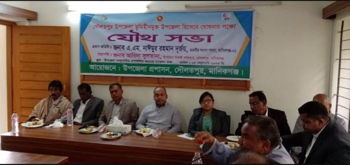 মোঃ আতিকুর রহমান, দৌলতপুর,মানিকগঞ্জঃ মানিকগঞ্জের দৌলতপুর উপজেলাকে ভূমিহীনমুক্ত উপজেলা করার লক্ষ্যে যৌথ সভা অনুষ্ঠিত হয়েছে। বুধবার দুপুরে দৌলতপুর উপজেলা সম্প্রসারিত প্রশাসনিক ভবনের সম্মেলন কক্ষে উপজেলা নির্বাহী অফিসার আবিদা সুলতানার সভাপতিত্বে এ যৌথ সভা অনুষ্ঠিত হয়। সভায় প্রধান অতিথি হিসেবে উপস্থিত ছিলেন-মানিকগঞ্জ-১ আসনের সংসদ সদস্য এ.এম.নাঈমুর রহমান দুর্জয়। দৌলতপুর উপজেলা পরিষদের চেয়ারম্যান, মো. নুরুল ইসলাম রাজা, উপজেলা আওয়ামীলীগ সভাপতি এ্যাড.এ.কে.এম আজিজুল হক, সাধারণ সম্পাদক আব্দুল কদ্দুস, উপজেলা ভাইস চেয়ারম্যান নাসির উদ্দিন আবুল, উপজেলা প্রকল্প বাস্তবায়ন কর্মকর্তা মো. মমিনুর রহমানসহ বিভিন্ন ইউনিয়ন পরিষদের চেয়ারম্যানবৃন্দ এ সময় উপস্থিত ছিলেন। প্রধান অতিথি এ.এম.নাঈমুর রহমান দুর্জয় বলেন- ‘মুজিব বর্ষে বাংলাদেশের একজন মানুষও গৃহহীন থাকবে না’ প্রধানমন্ত্রীর এ ঘোষণা বাস্তবায়নের লক্ষ্যে ভুমিহীন ও গৃহহীন প্রতিটি পরিবার কে ২ শতক জমিসহ গৃহ নির্মাণ করে দেয়া হচ্ছে। এছাড়াও যৌথ সভা শেষে দৌলতপুর সরকারি মতিলাল কলেজের বার্ষিক ক্রীড়া প্রতিযোগিতায় পুরস্কার বিতরণী ও নতুন ভবনের ভিত্তি প্রস্তর উদ্বোধন করেন মাননীয় সংসদ সদস্য মানিকগঞ্জ ১ আসনের এ এম নাইমুর রহমান দুর্জয়।