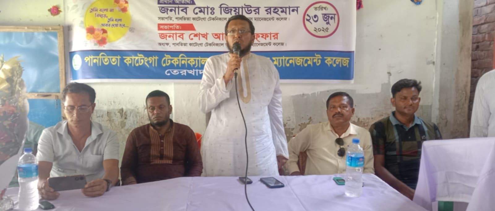 সাগর কুমার বাড়ই , বিশেষ প্রতিনিধিঃ ২৩ জুন সকাল ১১টার দিকে খুলনা জেলার তেরখাদা উপজেলার পানতিতা-কাটেঙ্গা টেকনিক্যাল এন্ড বিএম কলেজ মিলনায়তনে এইচ এস সি পরীক্ষার্থীদের বিদায় উপলক্ষে এক সংবর্ধনা অনুষ্ঠিত হয়। পানতিতা-কাটেঙ্গা টেকনিক্যাল এন্ড বিএম কলেজের অধ্যক্ষ শেখ আব্দুল গফ্ফারের সভাপতিত্বে অনুষ্ঠিত সংবর্ধনা অনুষ্ঠানে প্রধান অতিথির বক্তৃতা করেন কলেজ গভর্নিং বডির সভাপতি প্রভাষক মোঃ জিয়াউর রহমান। সম্মানিত অতিথি হিসেবে বক্তৃতা করেন তেরখাদা প্রেসক্লাবের সভাপতি দৈনিক পূর্বাঞ্চল ও জাতীয় দৈনিক ইত্তেফাক পত্রিকার তেরখাদা প্রতিনিধি এস এম মফিজুল ইসলাম জুম্মান , কলেজের শিক্ষাবিদ সদস্য খন্দকার আব্দুর রউফ , কলেজের অভিভাবক শ্রেণির সদস্য মোঃ ইসমাইল হোসেন ও সমাজসেবক দ্বীন মোহাম্মদ মোল্যা। প্রভাষক উত্তম রায় ও মোঃ রুবেল এর সঞ্চালনায় আয়োজিত সংবর্ধনা অনুষ্ঠানে অন্যান্যের মধ্যে বক্তৃতা করেন এবং উপস্থিত ছিলেন কলেজের প্রভাষক যথাক্রমে এস এম মোস্তাক আহমেদ , হাবিবা সুলতানা পপি , শেখ মোঃ আল-মামুন , রণজিৎ কুমার বাড়ই , সোনিয়া খাতুন , মুক্তা মণি ও লায়লা পারভীন। অনুষ্ঠানে কলেজের শিক্ষার্থী , শিক্ষকমন্ডলী ও গণ্যমান্য ব্যাক্তিবর্গ উপস্থিত ছিলেন।